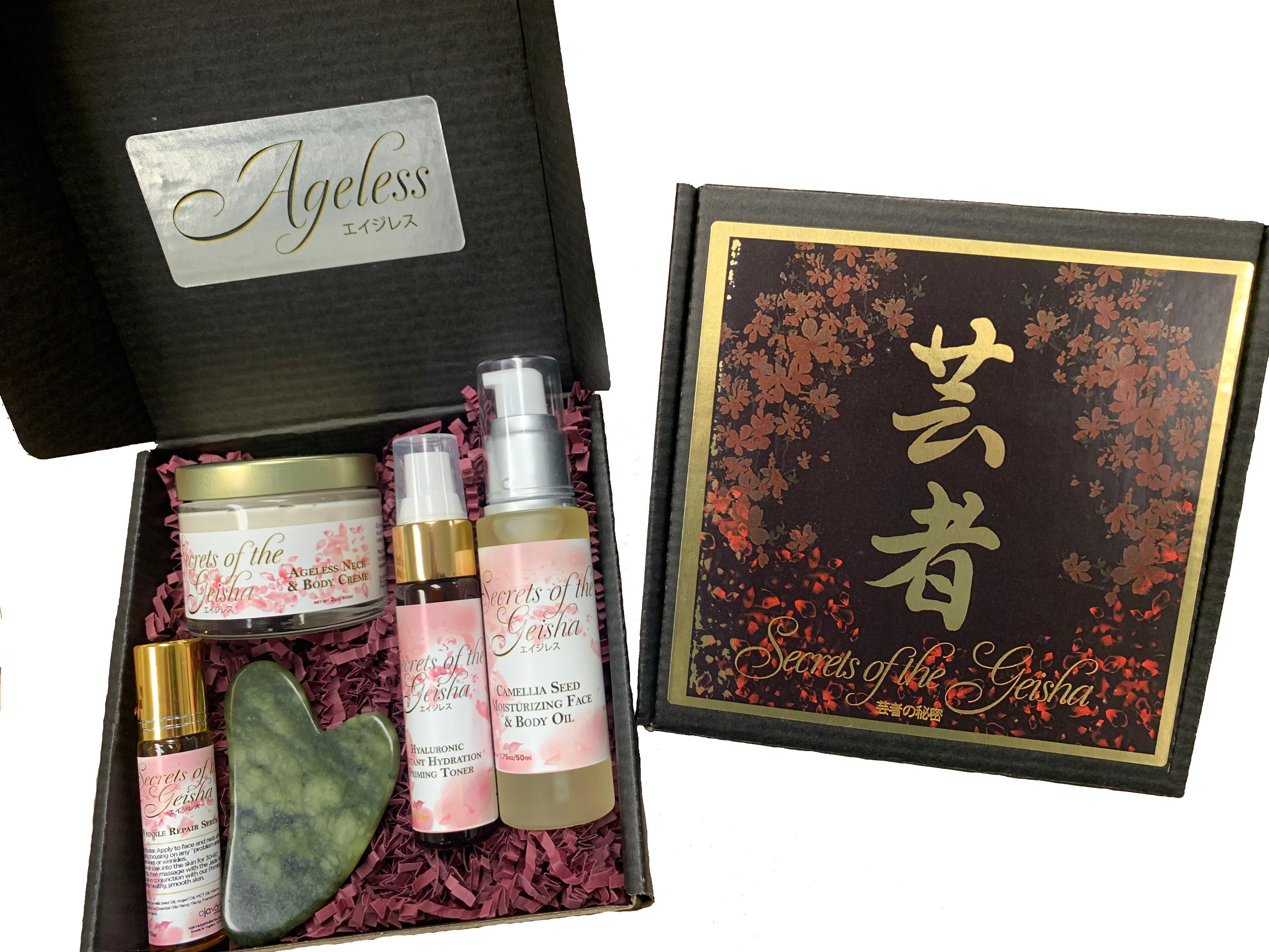 Secrets of the Geisha Gift SetIncludes full Secrets of the Geisha beauty line:10ml Wrinkle Repair Serum, 2oz Ageless Neck & Body Crème, 30ml Hyaluronic Instant Hydration Priming Toner, 50ml Camellia Seed Moisturizing Face & Body Oil, and Jade Guasha in an elegant black box. |